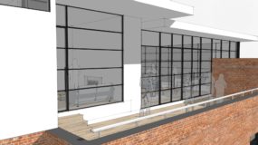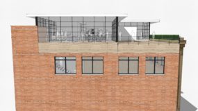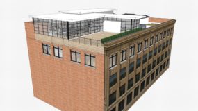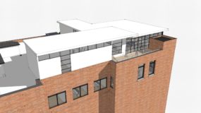 Amongst many renovations to the building, I conceived of and designed a 5th floor for this 4-story building; It was to be a penthouse where the owner could reside when in Detroit, a presentation and event space for the company that leased the building, and was designed to take in the views from the Detroit River after Joe Louis was torn down.